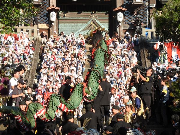 9月下旬まで、気温は連日30度を超えていましたが、10月に入るとさすがに過ごしやすくなってきました。とはいえ、30度に達する日もあり、残暑と秋のせめぎあいはまだ終わっていないようです。猛烈な暑さに見舞われたこの夏、長崎くんちの踊町(新橋町、諏訪町、新大工町、榎津町、西古川町、賑町)の方々の準備は本当にたいへんだったことでしょう。本番を間近に控えた10月3日には、使用する衣装や道具などを披露する「庭見世(にわみせ)」、続く4日には、踊町の演し物の仕上がりを町内の人に披露する「人数揃い(にぞろい)」が行われました。