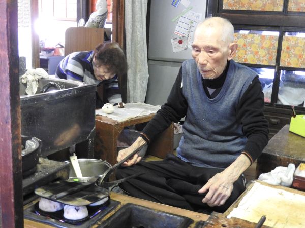 「大徳寺の大クス」のそばには、古い看板をかかげた古民家があります。創業明治20年(1887)、現在3代目という高齢のご夫妻が営む「大徳寺焼餅」のお店です。1人前が4個入りで800円。奥さんが生地に、こしあんを包んで手際よく丸めると、それをご主人が重たい鉄型に並べ、ひっくり返しながら焼いています。聞けば、建物も道具もほぼ創業当初のままだとか。4口あるガスの焼き釜は、昭和初期にはじめてガスが使われるようになったときに設置したもの。現在は1口だけしか使わないが、先代の頃、4口ともフル稼働させていた時代もあったそうです。