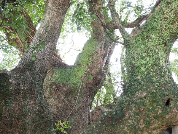 樹齢およそ800年超。長崎県指定の天然記念物で、県下第一のクスの巨木といわれています。1カ所から見上げるだけでは、全体像がつかめない大きさで、20年以上前の紹介文には、根のまわりが23.35mもあると書かれています。この大クスは、本幹が1本天に向かって伸びているというタイプではなく、幹は根元に近いところから大きく3つに分かれ、さらにそこからたくさんの枝を伸ばしています。根を下ろしている場所が、入り組んだ斜面であることが、樹の成長に影響を与えているのかもしれません。