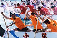 細長い舟の長さは昔はまちまちでしたが現在は大会の規定で約13.6m、乗員も30名以内(漕ぎ手26名以内、太鼓、銅鑼(ドラ)、舵手、采振り、あか汲み)と決められています。1mほどもある櫂を手にした漕ぎ手の若者達が、太鼓と銅鑼の囃子に合わせてスピードを競う様は、まさに圧巻です。(“)生デ見テホシイ!