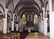建築学的にも珍しい神ノ島教会は、れんが造りの平屋建て。 創建当初、表面は漆喰で塗られでしたが、現在は石灰・セメントが塗られています。 中に入るとこうもり傘のように弧を描くいくつものアーチが天井を支え、 窓枠には赤・青・緑・橙・黄色などの古めかしい雰囲気のステンドグラスがはめ込まれていました。