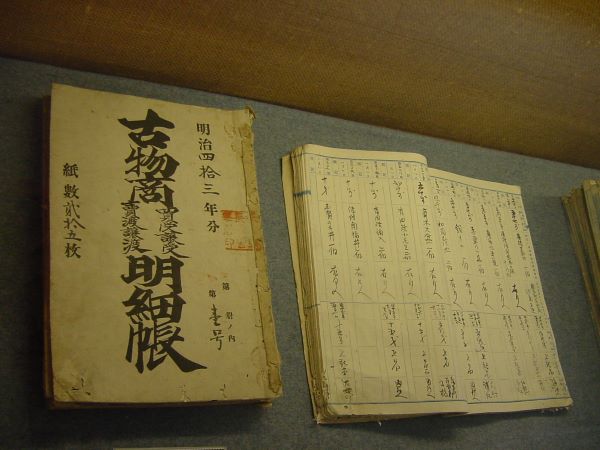 もうひとりの骨董屋、尾張榮太郎氏は、麹屋町にほど近い諏訪町に1910年(明治43)に開業。創業時から亡くなる前年の1937年(昭和12)までの帳簿、「古物商明細帳」が展示されていました。そこには、「亀山焼」、「赤絵オランダ皿」、「朝鮮焼皿」、「唐物青磁一輪生」など、日本国内はもとより、中国やオランダの品々がひとつひとつ書き出され、いつ、いくらで、誰から購入し、誰に売ったかが細かく記されています。当時の骨董品の流れの一端が見えると同時に、開港後の激動の時代の中、外国商人が行き交い豊かだった長崎の町の気配も感じられ、興味深いものがあります。ちなみに「長崎ラムネ物語」もほぼ同時代(幕末~明治~大正)の話です。