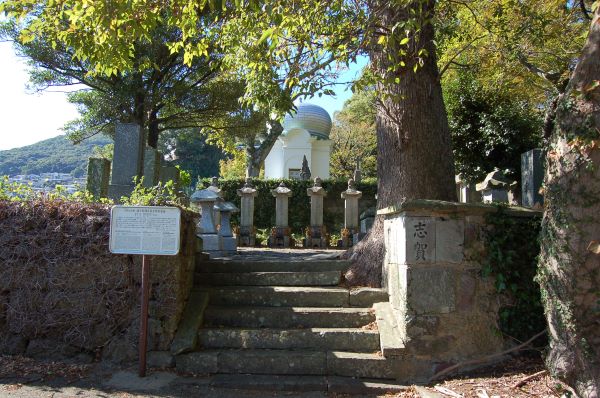 烏岩神社から小さな谷をくだった先に、悟真寺(ごしんじ)があります。1598(慶長3)に開かれたこのお寺は唐人の菩提寺とされました。悟真寺の墓地は長崎に3つある国際墓地のひとつで、その墓域には唐人墓地、ロシア人墓地、オランダ人墓地があります。ロシア人墓地にはロシア正教の小さなチャペルがあり、往時を偲ばせます。庄屋志賀家のお墓もロシア人墓地の隣にありました。ちなみに幕末の頃の志賀家の当主親朋(ちかとも)は露語の通訳になり、ロシアにも留学。維新後はロシアとの外交交渉に通訳として関わったそうです。悟真寺の国際墓地は、稲佐の個性的な歴史をいまも静かに物語っています。