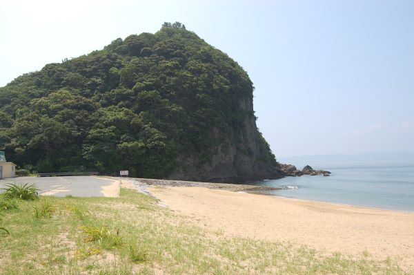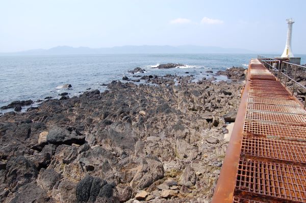 島原半島をさらに北上して国崎半島の付け根にある漁港へ。恵比寿様が祀られたその先の海沿いの遊歩道をいくと約130万年前の噴火による輝石安山岩の土石流がたまったものだという地層がありました。この安山岩は橘湾をはさみ13km先の北東に位置する有喜(うき)という地域で見られる安山岩と同じだとか。もしかしたら橘湾がなかった頃は、ひとつの大きな火山だったかもしれないと考える学者もいます。また、橘湾沿いの海岸線を走ると、海に面して切り立ったような地形が何カ所か見られますが、これは海底火山の力が加わったことで、絶壁の先にあった地形が海に沈みこんだものと考えられています。