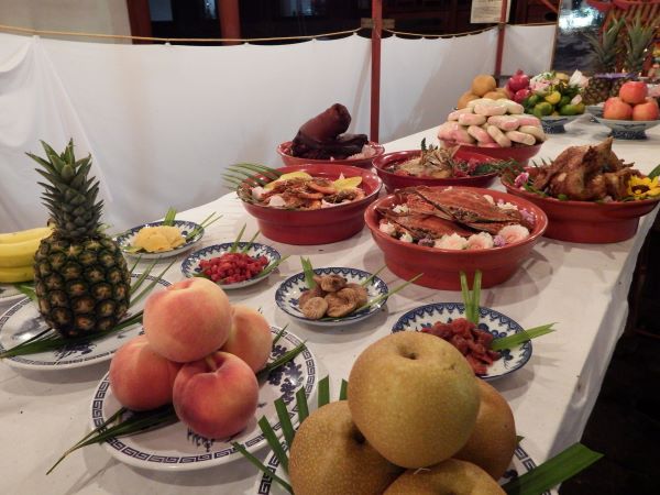 白飯、キクラゲ、寒天、高野豆腐など、十数種類の精進料理が白いお皿にズラリと並べられたお供え物は圧巻。唐寺の軒下で極彩色の光景を眺めていると、ときどき竹線香やジャスミンに似た甘い香りを風が運んできます。お坊さんたちの歌うような読経にも何となくうっとりしてしまい、時間を忘れてしまいそうです。