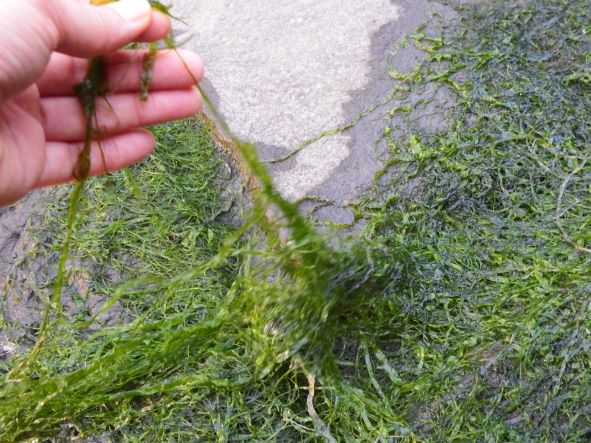 早春の気配が漂いはじめる1月下旬~2月初旬、長崎県下では各地の海岸でアオサ摘みがはじまったというローカルニュースが流れます。深緑色をした海藻のアオサは、水洗いして乾燥させ、お吸い物や味噌汁、天ぷらなどにしていただきます。実は同時期、眼鏡橋のひとつ下流に架かる袋橋のたもとでも鮮やかな緑色をした海藻が目立つようになるのですが、よくよく見てみるとこれがアオサだったのです。
