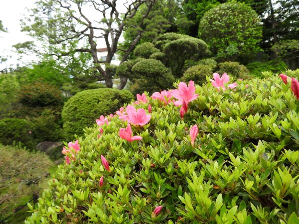 庭園の池を囲むように植えられたサツキが、開花時期を迎えていました。庭木や盆栽として古くから日本人に親しまれてきたサツキ。ツツジより小ぶりの花は、次々に咲いて長く楽しめます。今月中旬には見頃を迎えるそうです。