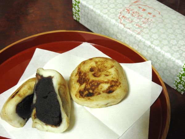 「大徳寺の大クス」のそばには、古い看板をかかげた古民家があります。創業明治20年(1887)、現在3代目という高齢のご夫妻が営む「大徳寺焼餅」のお店です。1人前が4個入りで800円。奥さんが生地に、こしあんを包んで手際よく丸めると、それをご主人が重たい鉄型に並べ、ひっくり返しながら焼いています。聞けば、建物も道具もほぼ創業当初のままだとか。4口あるガスの焼き釜は、昭和初期にはじめてガスが使われるようになったときに設置したもの。現在は1口だけしか使わないが、先代の頃、4口ともフル稼働させていた時代もあったそうです。