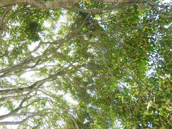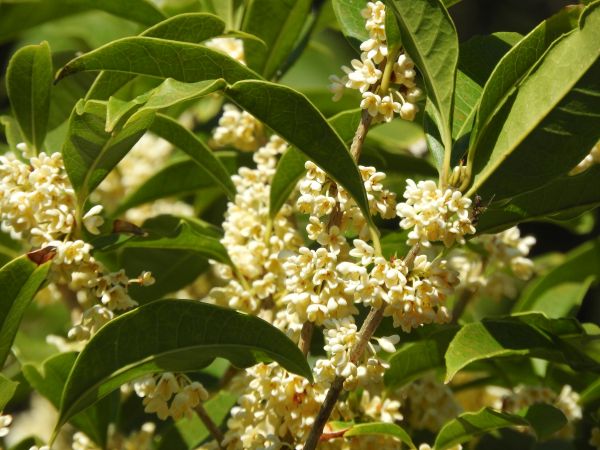キンモクセイの花はオレンジ色、ギンモクセイは淡い黄色。香りはキンモクセイの方が甘く濃厚で、遠く離れた街角まで届くのに対し、ギンモクセイはやや弱く、樹の周辺をひかえめな香りで包みます。ちなみに、キンモクセイとギンモクセイは同じモクセイ科の常緑高木。植物の分類では、ギンモクセイが先にあり、キンモクセイはその変種になるそうです。