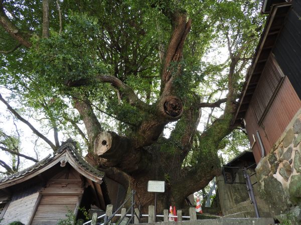 樹齢およそ800年超。長崎県指定の天然記念物で、県下第一のクスの巨木といわれています。1カ所から見上げるだけでは、全体像がつかめない大きさで、20年以上前の紹介文には、根のまわりが23.35mもあると書かれています。この大クスは、本幹が1本天に向かって伸びているというタイプではなく、幹は根元に近いところから大きく3つに分かれ、さらにそこからたくさんの枝を伸ばしています。根を下ろしている場所が、入り組んだ斜面であることが、樹の成長に影響を与えているのかもしれません。