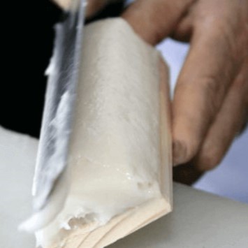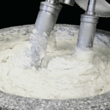 蒲鉾の美味しさを左右するのが歯ごたえです。その歯ごたえのためにこだわるのが「ブレンド」という工程です。昔ながらの石臼仕込みによって、すり身にほど良く空気を混ぜ込みふっくらと仕上げます。この石臼仕込みでは、蒲鉾の歯ごたえのほか、擂(す)られることによる温度変化が少なくてすむため、魚の鮮度や本来の旨みを壊さず美味しい蒲鉾を作ることができます。