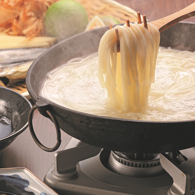 五島手延うどんは、古来より長崎の五島地方に伝わる伝統的な自然食品です。五島のおいしい水と、季節を通して自然乾燥に適した潮風、島に自生する椿からとれる良質の椿油より、さらにおいしいうどんになりました。